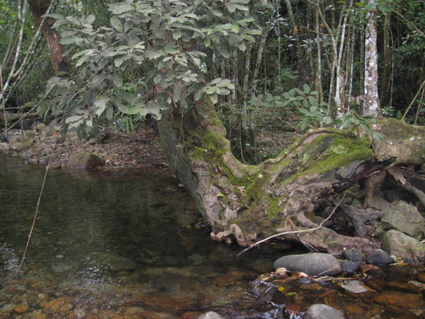 三水湾河谷雨林位于黎母山三星林岭脚下,在公园七家村度假山庄附近,主要功能是游览,野营和科学考察等,其河谷主要由三条小河相互缠绕形成各式的水湾深潭,因地势平坦谷地土壤肥沃,河边的两岸生长着种类繁多的雨林,有蕨娄植物之王的--沙椤,奇树异木随处可见,有的盘根错节、有的连理攀生、有的藤萝缠绕、还有不少挺拔叁天古木巨树。河床里的水潭清澈见底,游鱼可见,山水相映,仿佛就象一幅山水画,是一处不可多得罕见的热带雨林河谷。